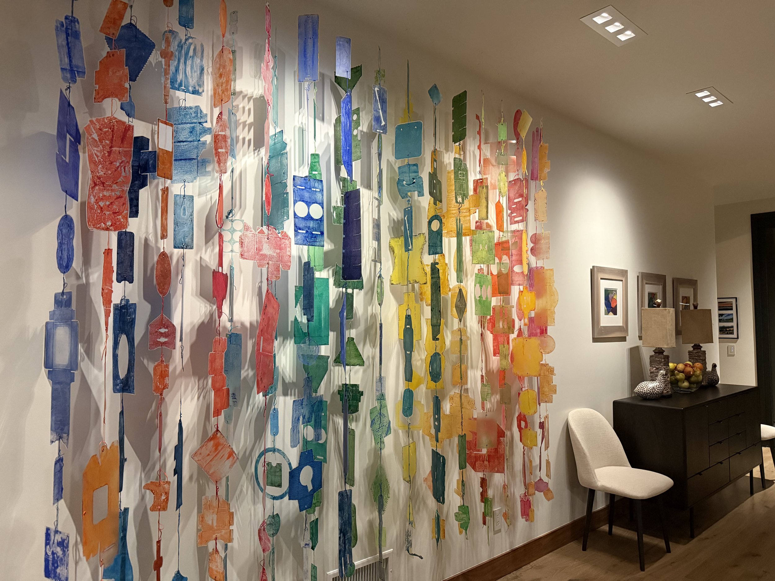 site-specific installation with hanging printed elements on vellum, grommets, miscellaneous bottle caps, and embroidery thread